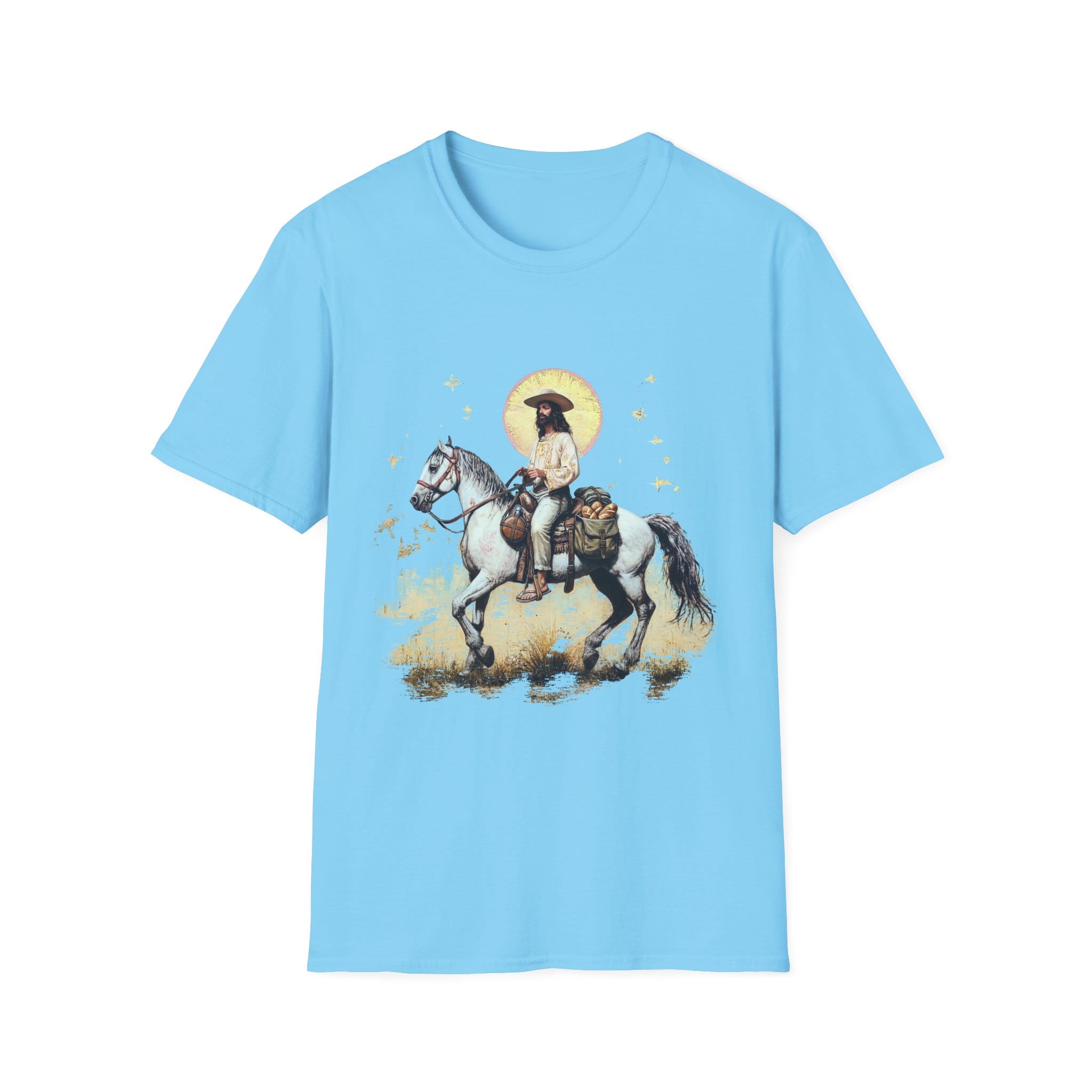 This lightweight cotton tee carries a quiet western daydream — a lone rider in a soft golden light, guiding a gentle grey horse across open grass. The muted palette and delicate star accents give the image a nostalgic, storybook feel: worn-in saddle, sun halo, and a moment paused between miles. It drapes easily, so the artwork reads like a personal emblem rather than loud branding. Wear it on trail-side coffees, casual market runs, or slow afternoons when you want clothing that feels familiar and a little wistful.